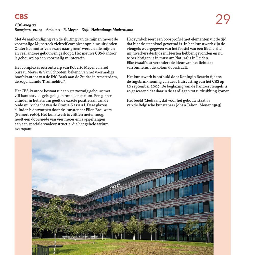 Met de aankondiging van de sluiting van de mijnen moest de voormalige Mijnstreek zichzelf compleet opnieuw uitvinden. Onder het motto ‘van zwart naar groen’ werden alle mijnen en veel andere gebouwen gesloopt. Het nieuwe CBS-kantoor is gebouwd op een voormalig mijnterrein. Het complex is een ontwerp van Roberto Meyer van het bureau Meyer & Van Schooten, bekend van het voormalige hoofdkantoor van de ING Bank aan de Zuidas in Amsterdam, de zogenaamde ’Kruimeldief’.