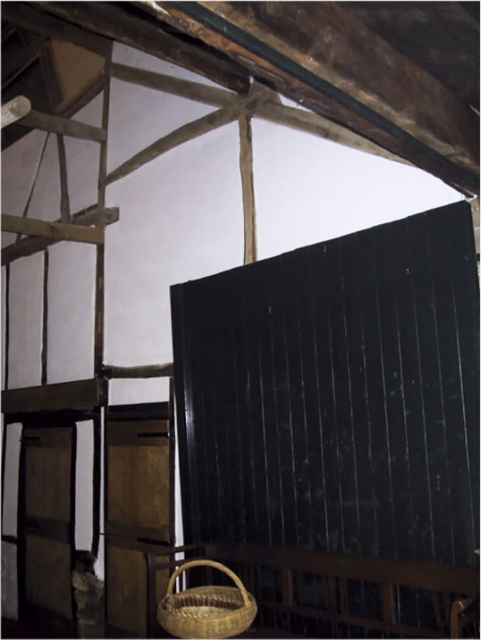 De naar de straat gerichte gevel van het schuurgedeelte bezit centraal een met een korfboog gesloten doorgang, waarin dubbele houten deuren zijn afgehangen. In de rechterdeur bevindt zich een klinket. Links hiervan bevindt zich een rechte deuropening, waarvoor een hardstenen trede, gesloten met een houten deur en een klein bovenlicht.