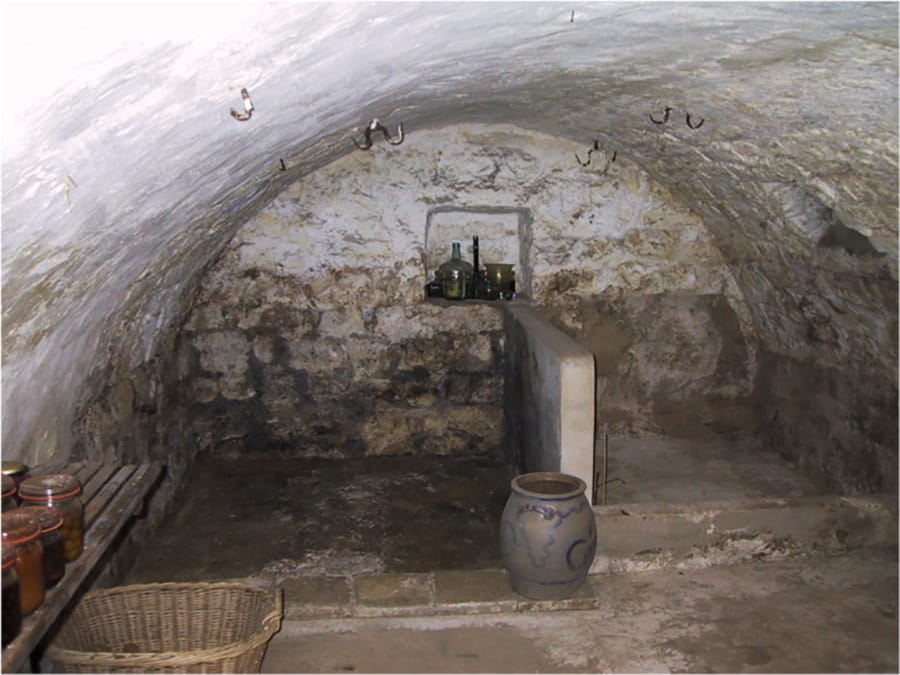 De ruimten zijn overdekt met gestuukte troggewelfjes tegen de kinderbinten. In de keuken resteren de hoge schouw en keukenkasten.