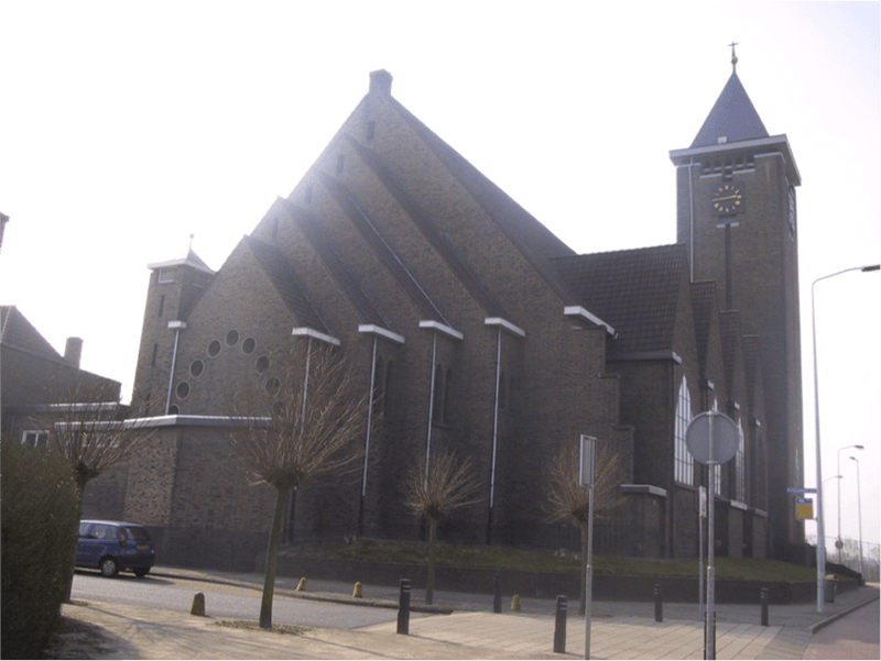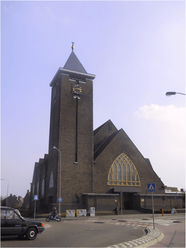 De linkerzijde van het kerkgebouw bestaat uit de hoofdbouwmassa met zadeldak, waar tegen vier dwarsbeuken zijn geplaatst. De achterzijde wordt gevormd door de koorsluiting in de vorm van de zich viermaal verjongende hoofdbouwmassa. In de topgevel van de dwarsbeuken bevindt zich een spitsboog-vensteropening, die via deelzuilen is verdeeld in vijf velden, voorzien van een glas-in-loodvulling.Â