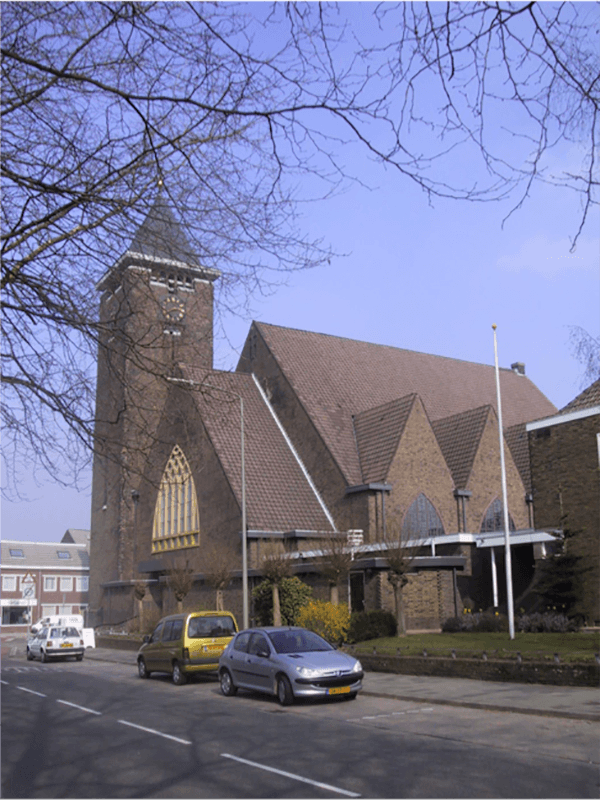 De voorzijde van het kerkgebouw wordt gevormd door de topgevel van de hoofdbouwmassa met zadeldak, waar tegen een iets lagere gelijkvormige bouwmassa is opgetrokken. Aan de linkerzijde staat tegen de lagere bouwmassa de rijzige kerktoren. Het front heeft een ondiepe éénlaags uitbouw met plat dak, die loopt van de basis van de toren en is voorbij de rechter zijgevel van het kerkgebouw doorgezet als gang.Â