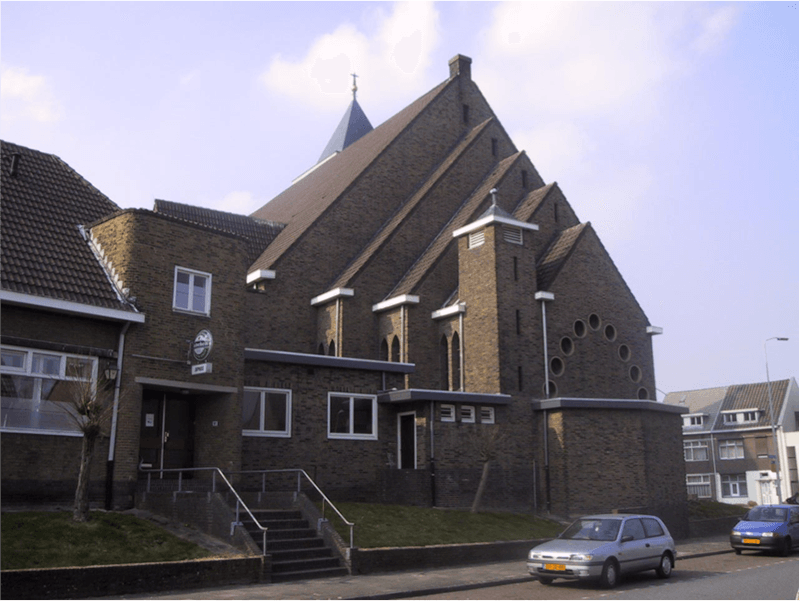 Deze eenbeukige hallenkerk is opgetrokken op een rechthoekig grondvlak. De rechthoekige grote toren heeft een spits in een piramidale vorm met een krachtige gootlijn. In de toren zijn lange sleuven opengehouden die de hoogte accentueren. De toren fungeert als oriëntatiepunt van de kolonie Meezenbroek/Schandelen.Â