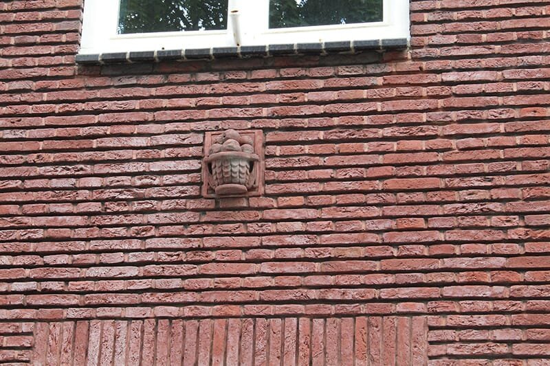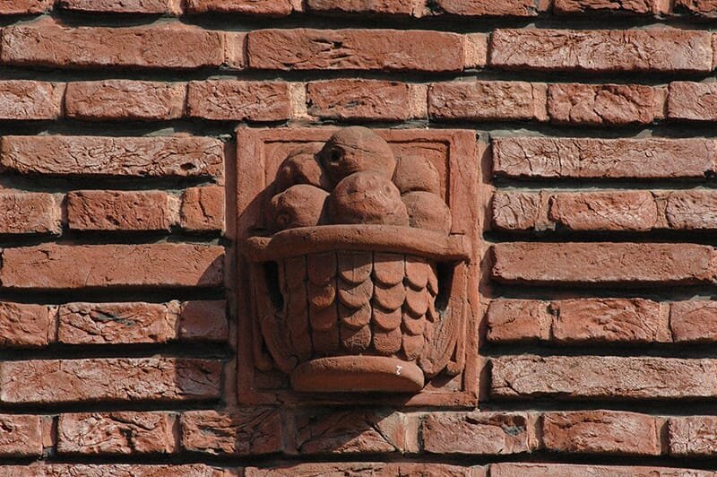 Een interessant detail is het gebakken ornament van rode klei in de vorm van een fruitmandje. Het fruitmandje was in de schilderkunst lange tijd een (onbeweeglijk) object voor een stilleven. Vaak getuigde zo’n ornament van overvloed. Met een stilleven toonden de kunstenaars hun virtuositeit aan. Het kleine proefstukje deed tevens veronderstellen dat zij tot meer in staat waren. Soms lijkt het een eigendomsmerkje van de architect.