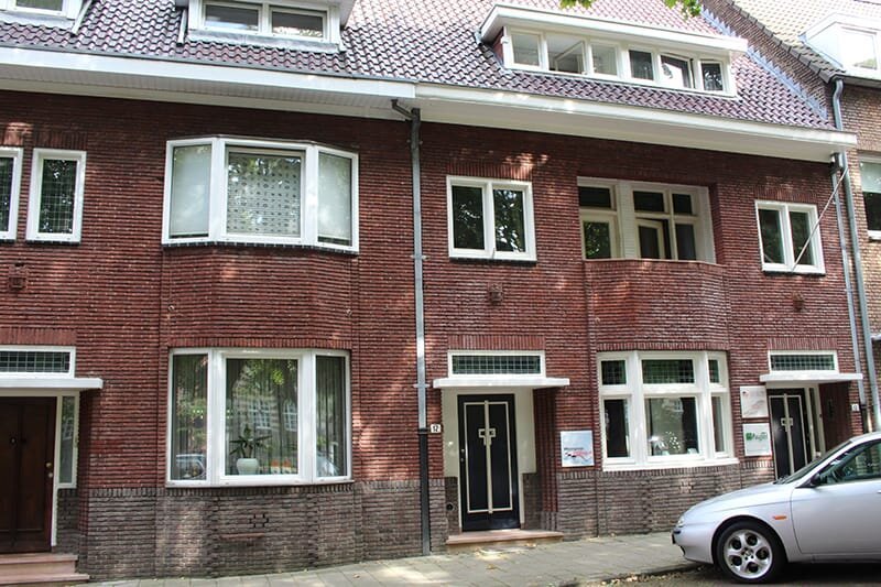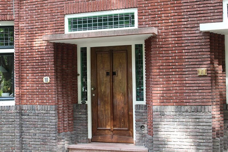 Krachtige horizontale lijnen zijn zichtbaar in de dakkapellen, de dakgoot en de luifels. De woningen links hebben boven de entree twee langwerpige ramen, gescheiden door een dun bakstenen kolommetje. Bij de dubbele woning rechts zijn de twee langwerpige ramen boven de entree gekoppeld binnen een groot vierkant kozijn met twee raam-vleugels. De voordeuren liggen in een portiekje met een luifel daarboven en een glas-in-lood bovenlicht.