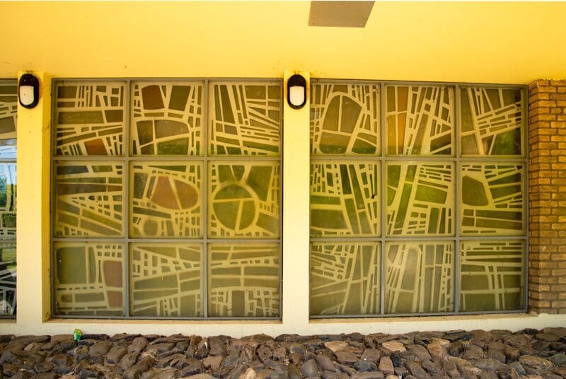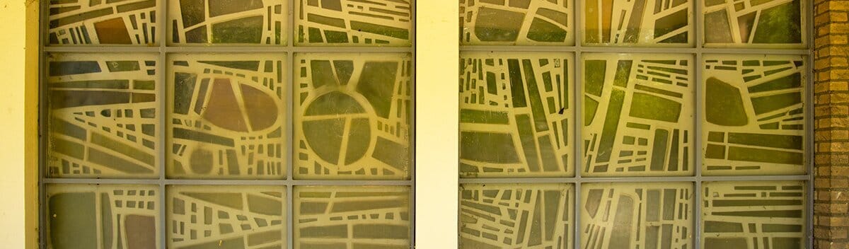 In de zijvleugels is een glas-in-beton kunstwerk van Theo Lenartz (Heerlen, 1937) aangebracht.