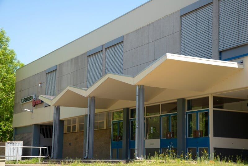 a. de voorbouw met parterre de ingangspartij, kassa’s, garderobe, toiletten bezoekers, beheer- en wedstrijdorganisatie; op de eerste verdieping: restaurant, toiletten en vergaderruimte.