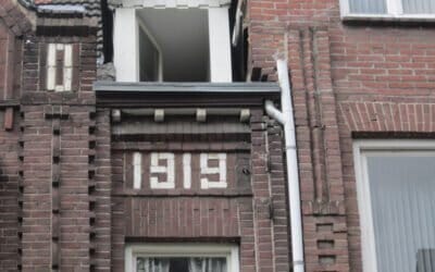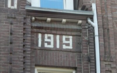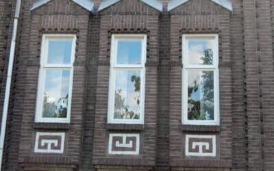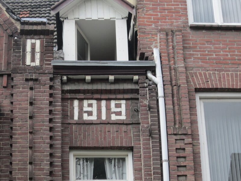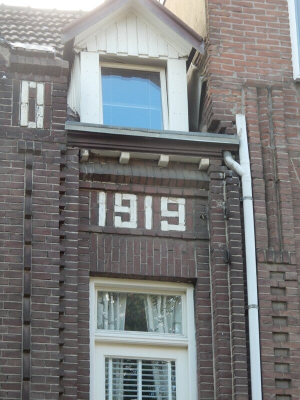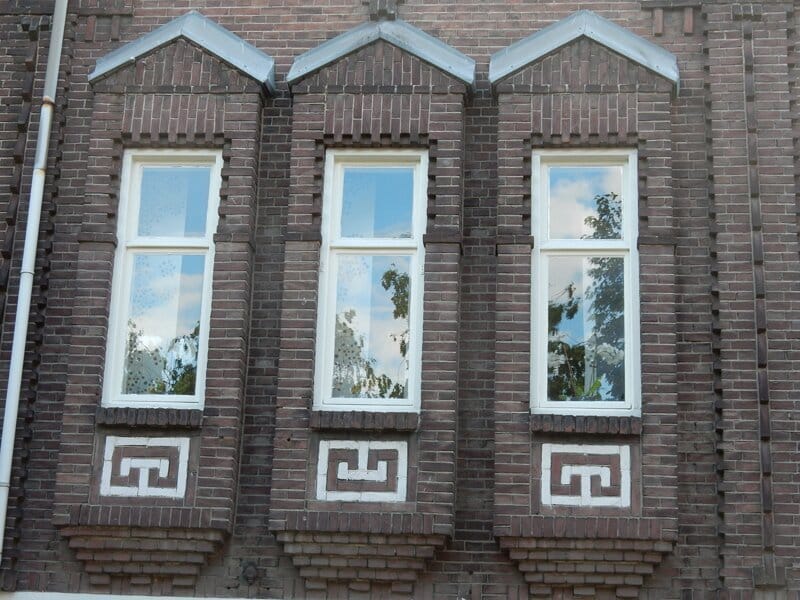 De baksteen ornamenten in de drie borstweringen op de verdieping, in de top van de twee penanten links en rechts en in de vorm van het jaartal vallen op door het rood-wit contrast en de evenwichtige aansluiting bij het overige metselwerk.