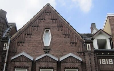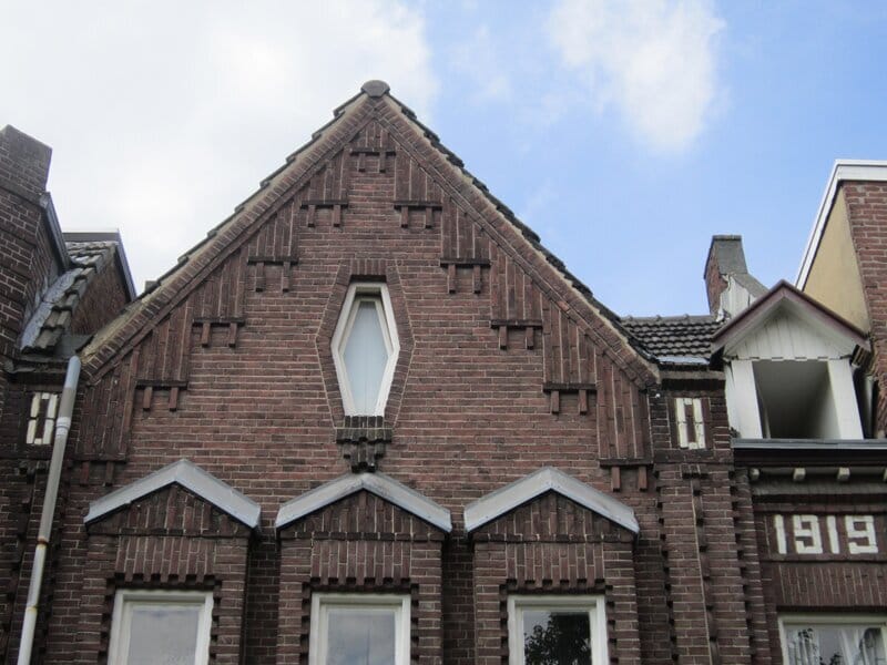 Deze wordt gekenmerkt door een baksteenarchitectuur met diverse decoratieve motieven. Dat blijkt vooral uit de expressief vormgegeven bekroning van de topgevel, met een regelmatige draperie, alsmede van de vensters op de verdieping.